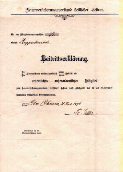 Das Großherzogliche Ministerium des Inneren zu Hessen-Darmstadt schrieb am 14. September 1897 dem Feuerversicherungsverband Hessischer Lehrer, z. H. des Lehrers Dern in Nieder-Ohmen:
